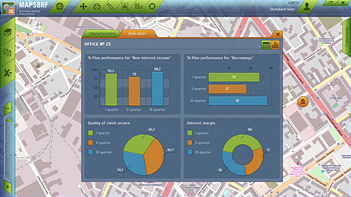 MapSBRF – a desktop application developed for visualizing main financial indicators on the map, for managing and monitoring internal quality checks based on the GEMBA system (quality management system), and for analyzing the parameters of the existing business network, with the possibility of optimizing it using the geomarketing method. The program allows you to improve the decision-making process and lessen business risks. By displaying real-time data from the ground, and by using the GEMBA internal control system and the GEOMARKETING module, it helps you optimize the business network and increase the quality of your services and the work of business entities or organizational sectors. It comprises 3 basic modules and can be expanded with additional models, as well as adapted to the needs of each client.